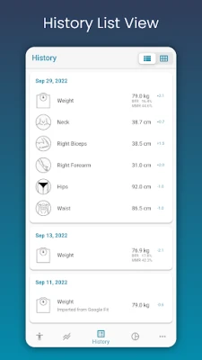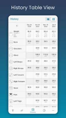 Don't waste any more time interpreting your progress. Your weight loss & muscle gain progress is now easy to follow. Find all of your measurement history in a single location! View data in Chart, Table and List formats. Pick one that works for you!