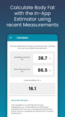 - Estimate your body fat quickly and easily using the in-app body fat calculator.