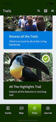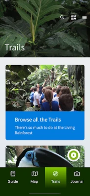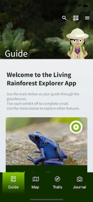 Welcome to the Living Rainforest. Our centre in Berkshire is home to an amazing collection of rainforest plants and animals from around the world. We have built this app for visitors to use to explore the centre by discovering Trails. Use the map to find your way around, and take some of the plants and animals home with you through the magic of Augmented Reality. Don't forget to keep a journal of your visit with photos and your favourite discoveries.