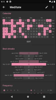 In addition to showing your current streak, Loop has an advanced formula for calculating the strength of your habits. Every repetition makes your habit stronger, and every missed day makes it weaker. A few missed days after a long streak, however, will not completely destroy your entire progress, unlike other don't-break-the-chain apps.